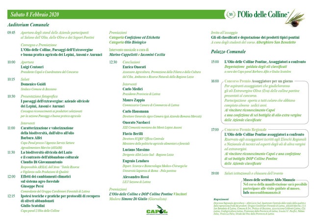 In mattinata, a partire dalle ore 10:00, all’Auditorium comunale, si terrà il convegno dedicato all’ambiente montano. Insieme ad esperti del settore e della materia Si parlerà di: “Caratterizzazione e valorizzazione della biodiversità, dall’olivo all’olio”, “La biodiversità olivicola del Lazio e il contrasto dell’abbandono colturale”, “Effetti dei cambiamenti climatici sul sistema agro-forestale”, “Ipotesi teoriche e pratiche per protocolli di recupero di oliveti abbandonati”. Nel mentre si procederà alle premiazioni dei concorsi “L’Olio delle Colline”, “DOP Colline Pontine”, “Miglior Olio Biologico” e “Paesaggi dell’Extravergine e Buona pratica agricola”, con intermezzo musicale del “Trio Mozart”. A seguire l’invito all’assaggio degli oli in concorso e degustazione dei prodotti tipici pontini a cura degli studenti del corso Alberghiero “San Benedetto”.
